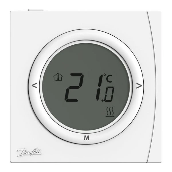 Easy to operate via its large backlit LCD display, the Danfoss RET2001 RF digital room thermostat allows for temperature selection using the intuitive ring that surrounds the display. Useful functions include a frost protection setting as well as holiday mode, complete with set-back temperature, helping homeowners to reduce waste when they’re not at home. Communicating with an RF unit located up to 30M away, the included RX1-S receiver employs secure digital radio communication. Ideal for zoning, the thermostat has a unique identity code learnt by the receiver during commissioning.Large, easy-read backlit display shows the room temperature and output statusIncludes holiday modeFrost protect temperature settingsStandby/off positionMaximum and minimum temperature limit settingsMultiple cable access options for ease of installationIndustry standard backplate for receiverBoiler Plus compliant